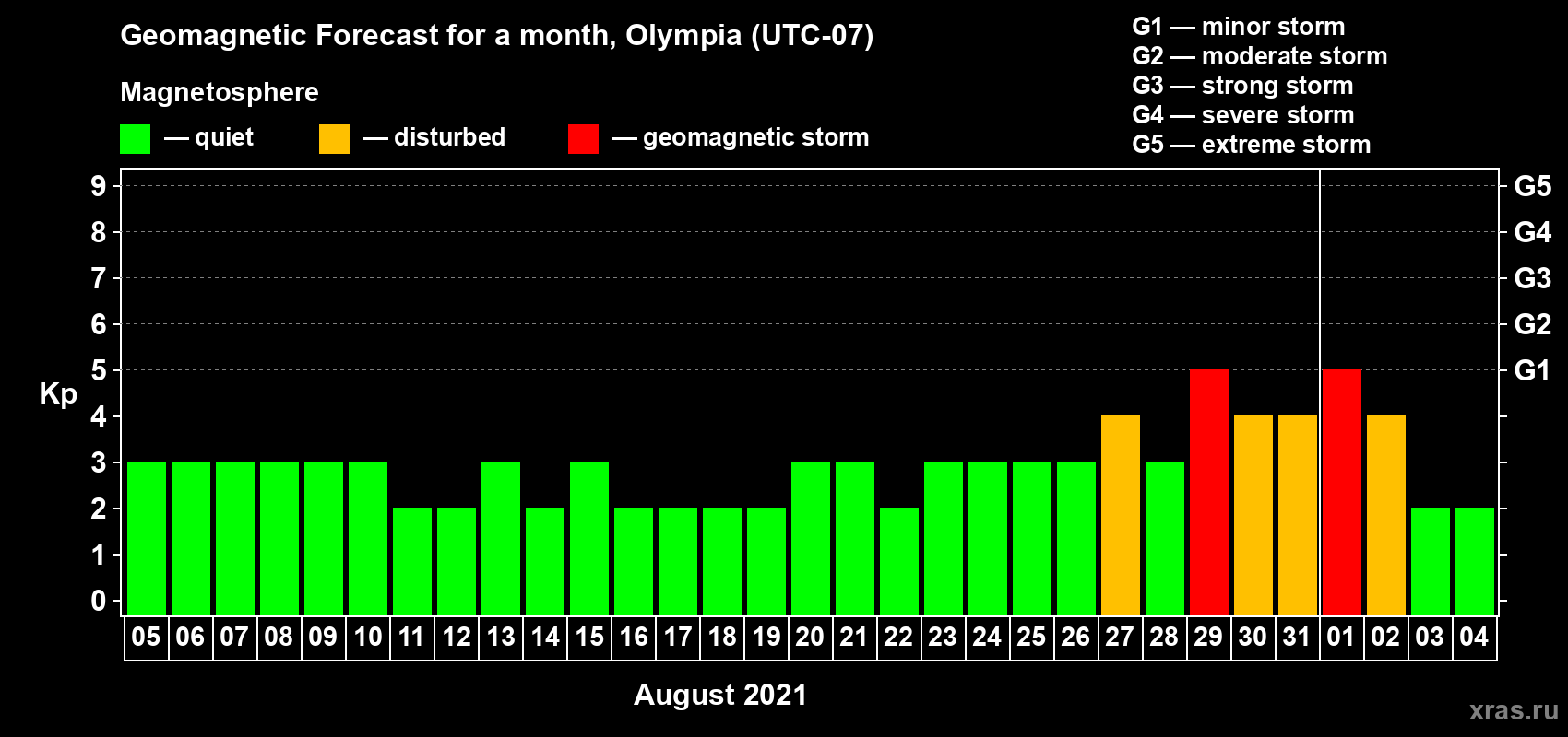 Geomagnetic storm forecast in Olympia for Aug 05, 2021