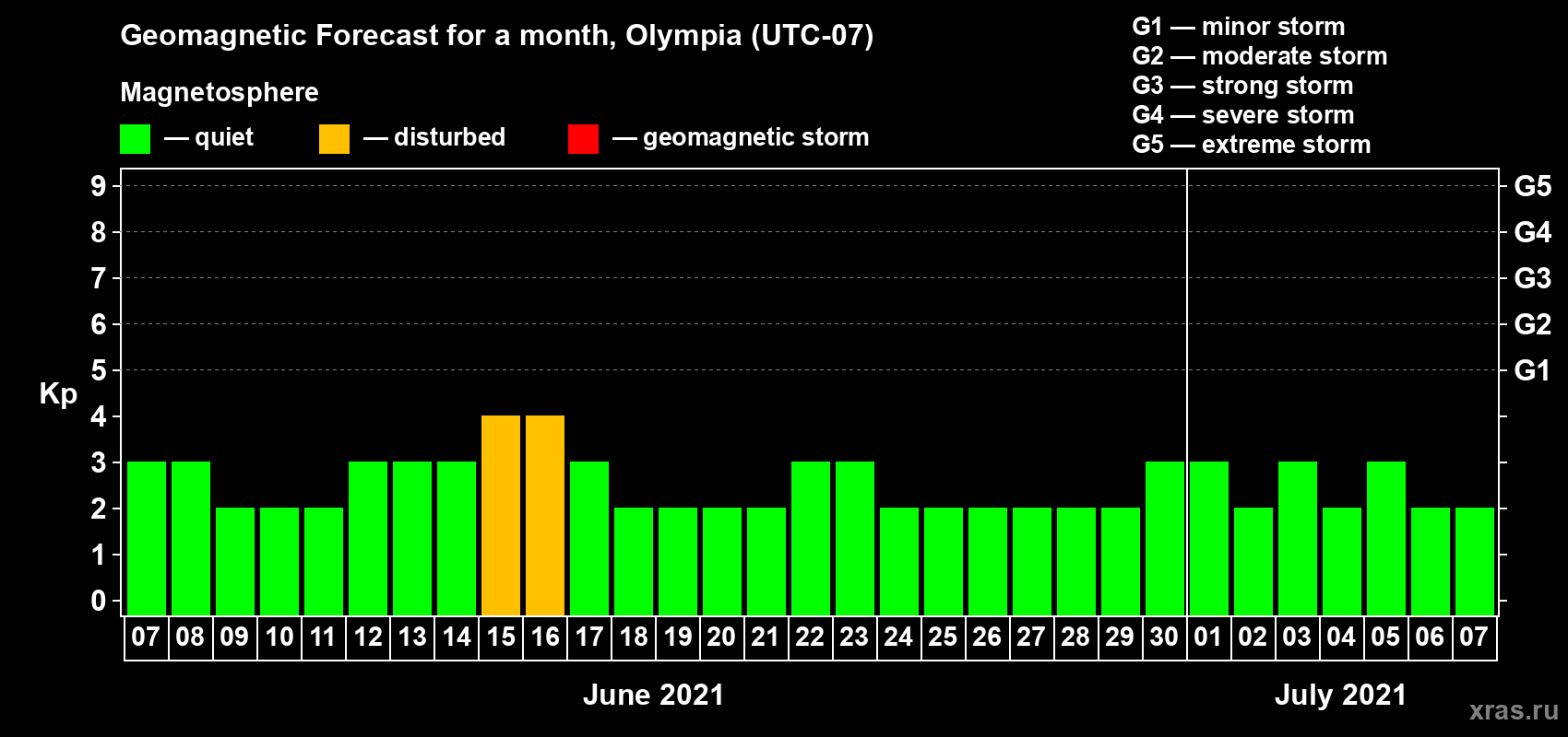 Geomagnetic storm forecast in Olympia for Jun 07, 2021