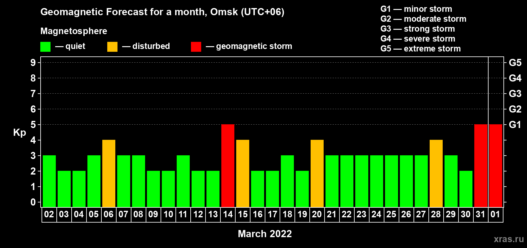 Geomagnetic storm forecast in Omsk for Mar 02, 2022