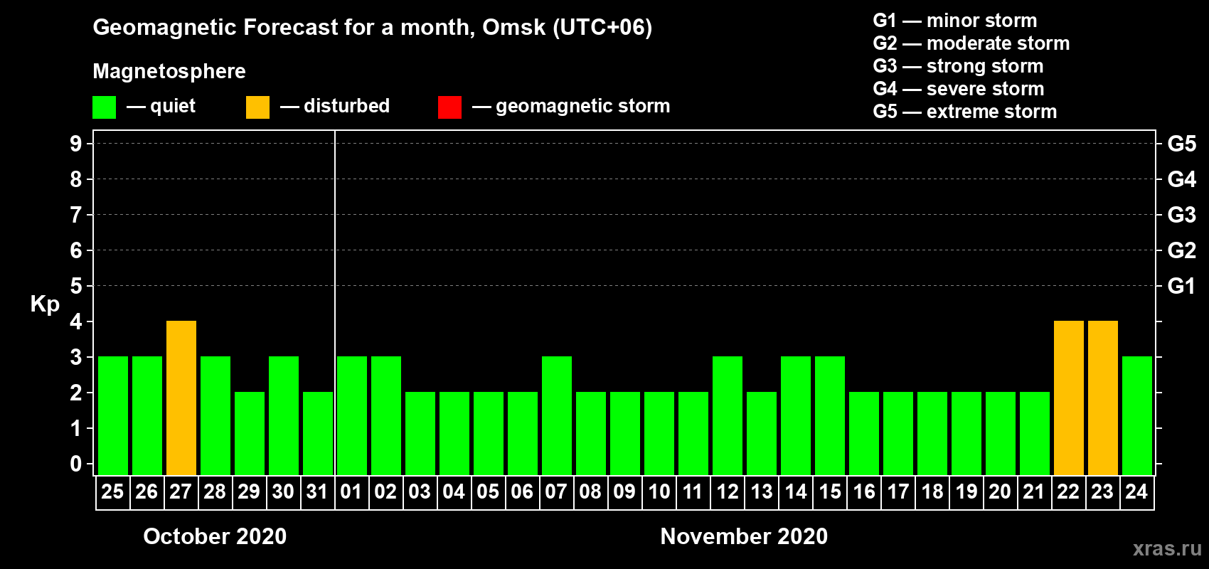 Geomagnetic storm forecast in Omsk for Oct 25, 2020