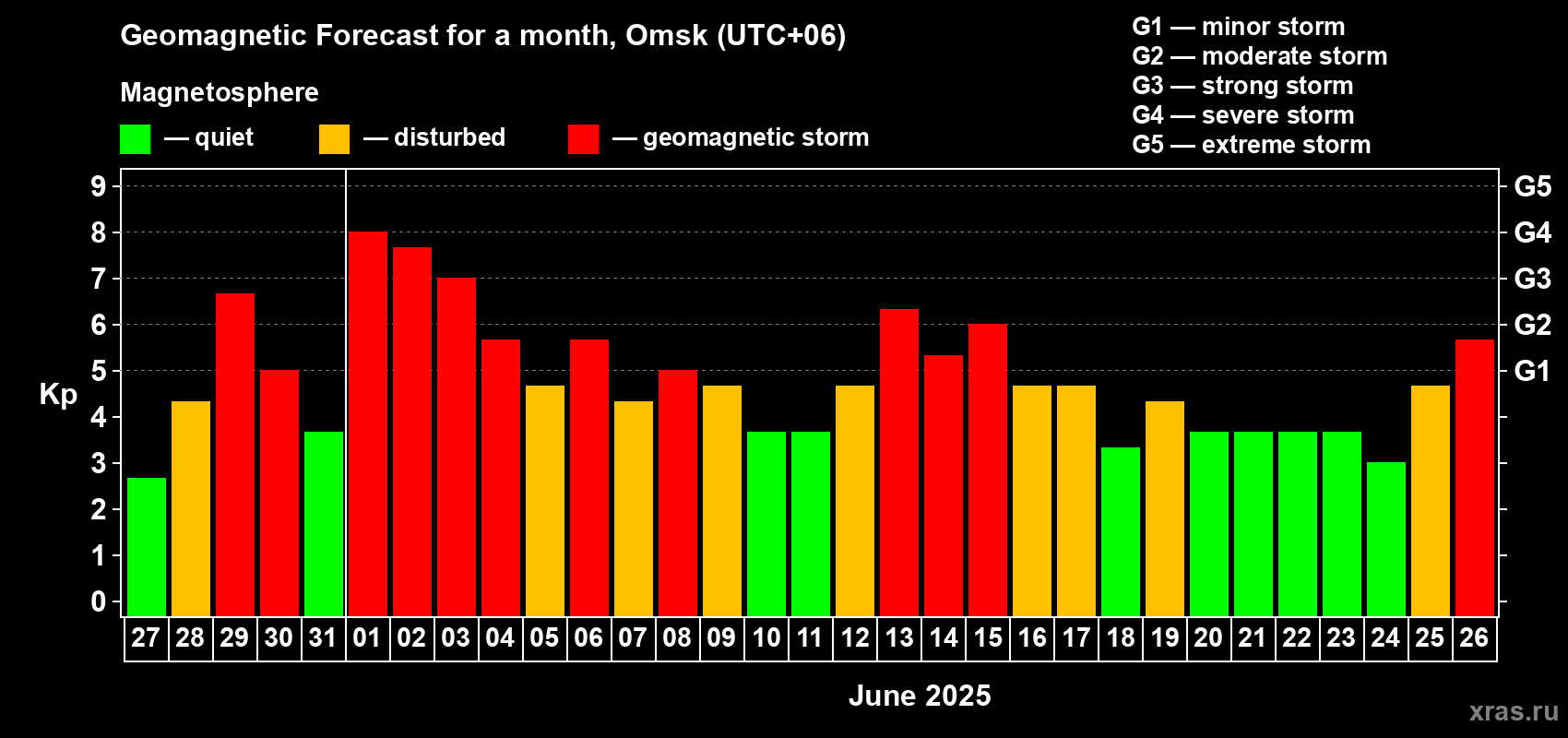 Geomagnetic storm forecast in Omsk for May 27, 2025