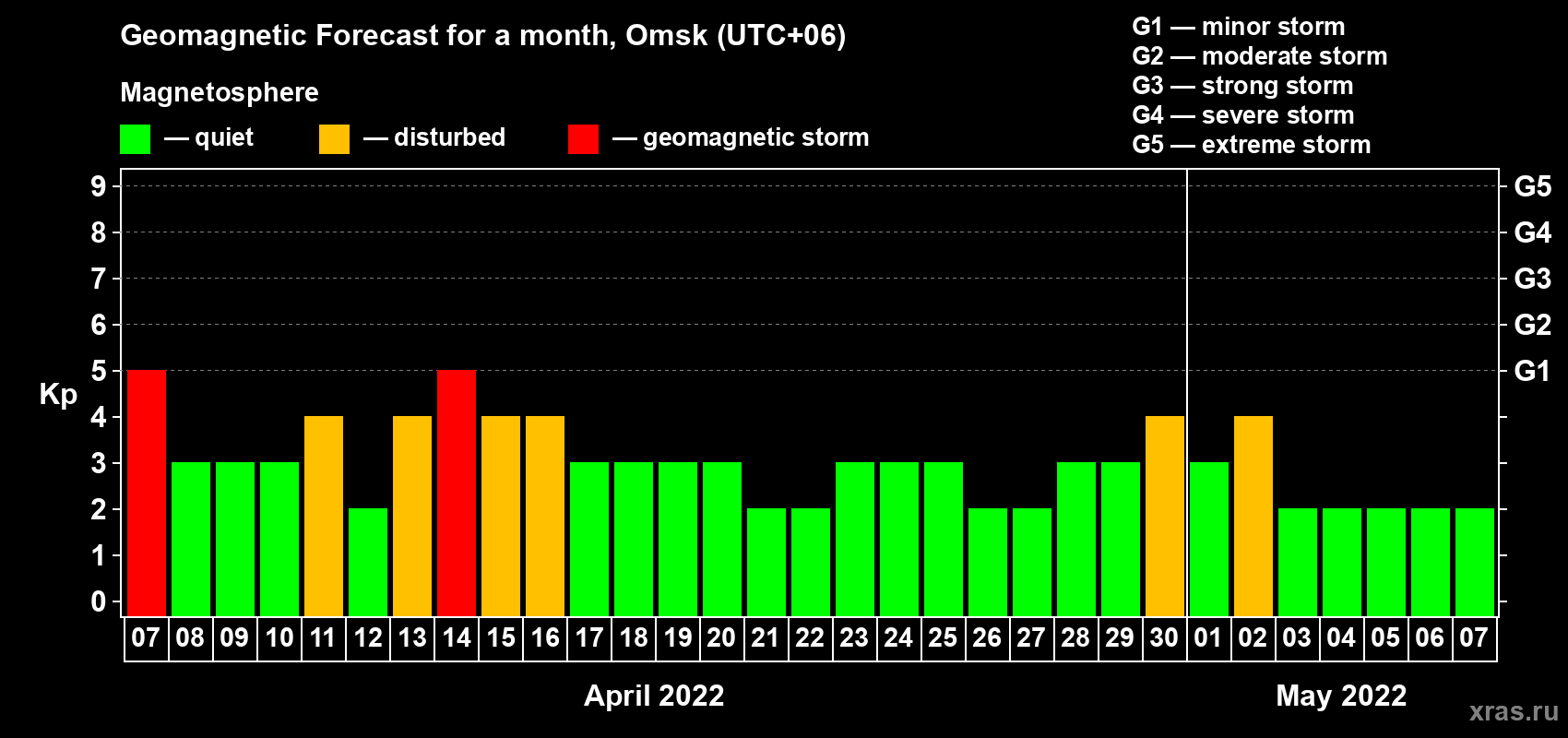 Geomagnetic storm forecast in Omsk for Apr 07, 2022