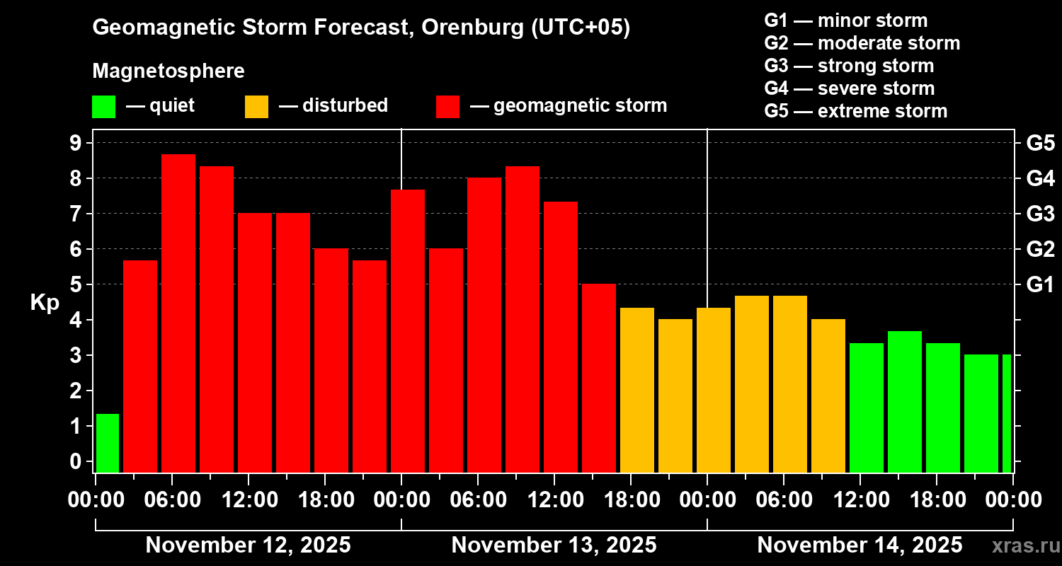Geomagnetic storm forecast in Orenburg for Nov 12, 2025