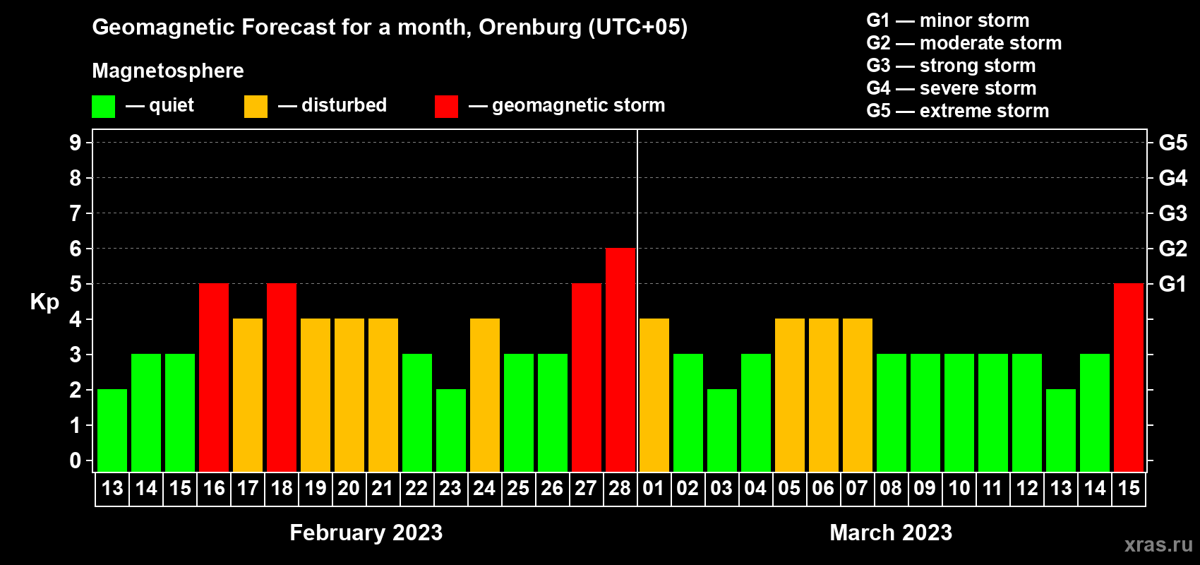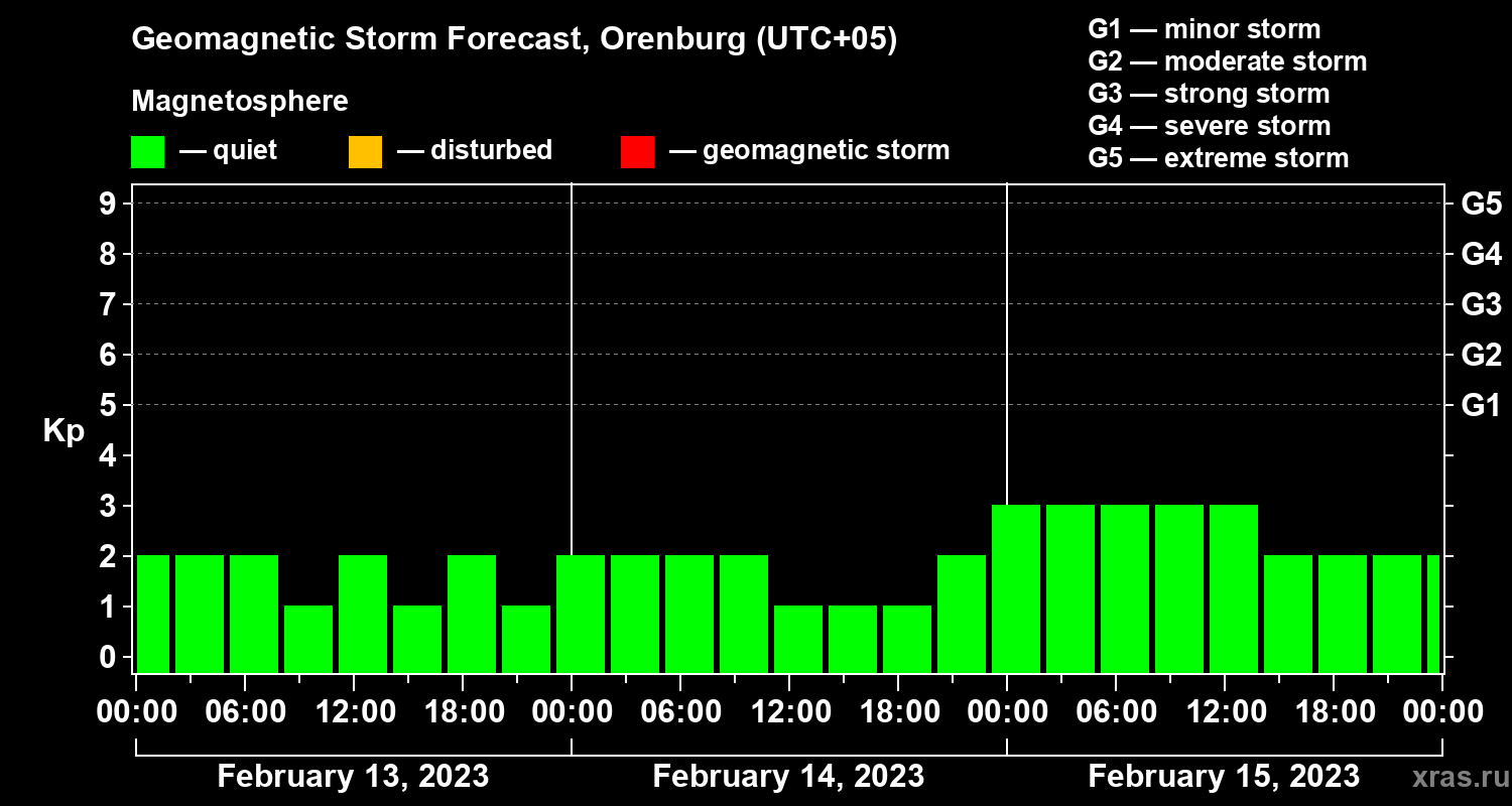 Geomagnetic storm forecast in Orenburg for Feb 13, 2023