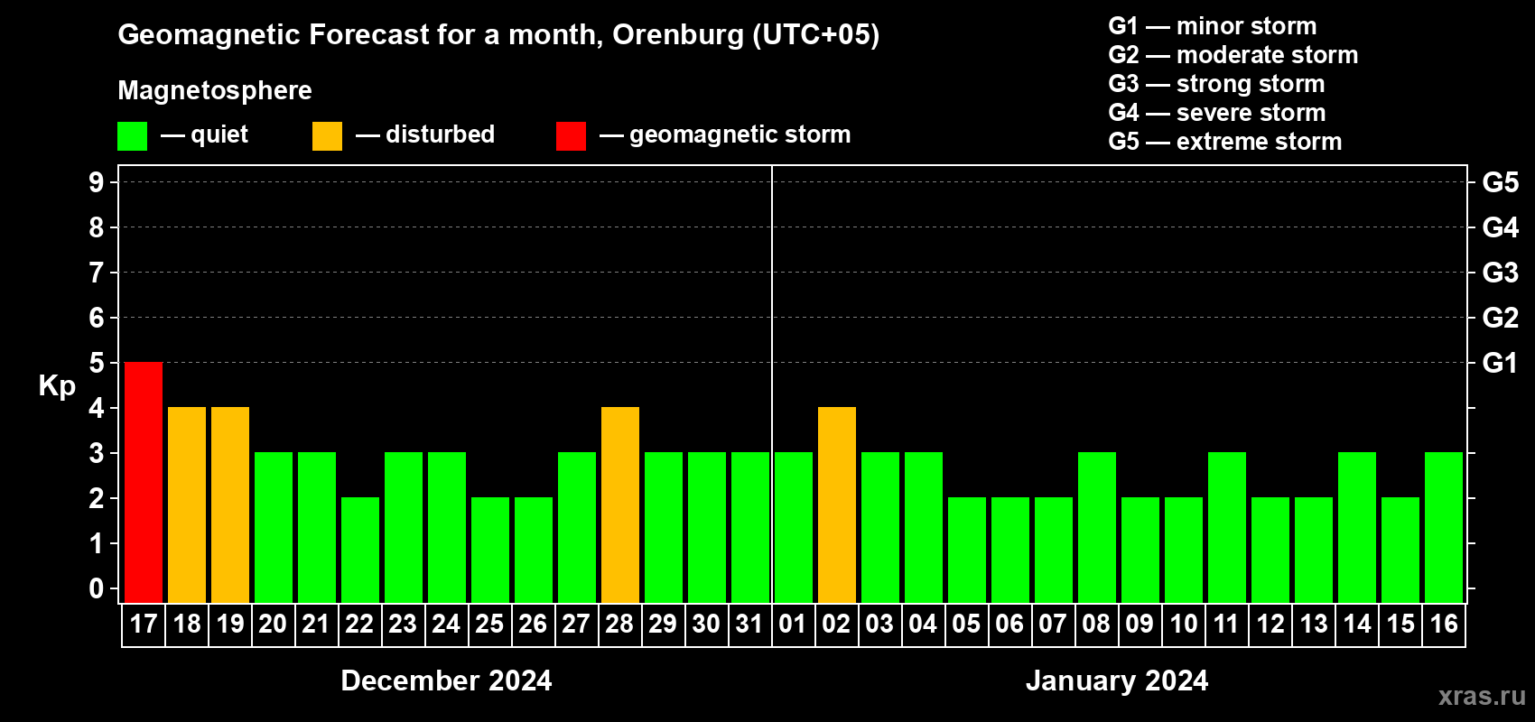 Geomagnetic storm forecast in Orenburg for Dec 17, 2023