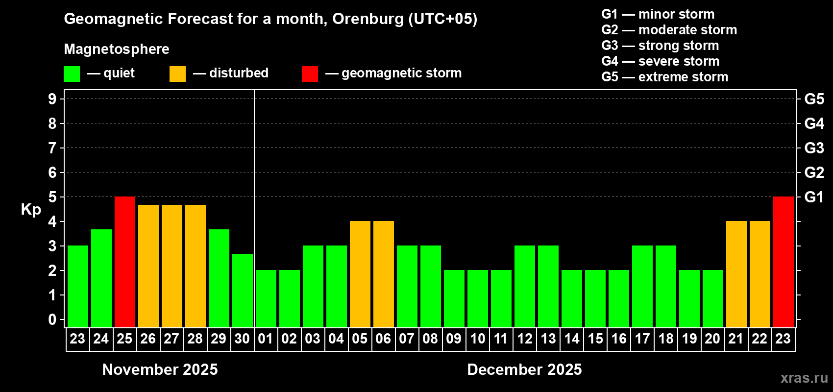 Geomagnetic storm forecast in Orenburg for Nov 23, 2025