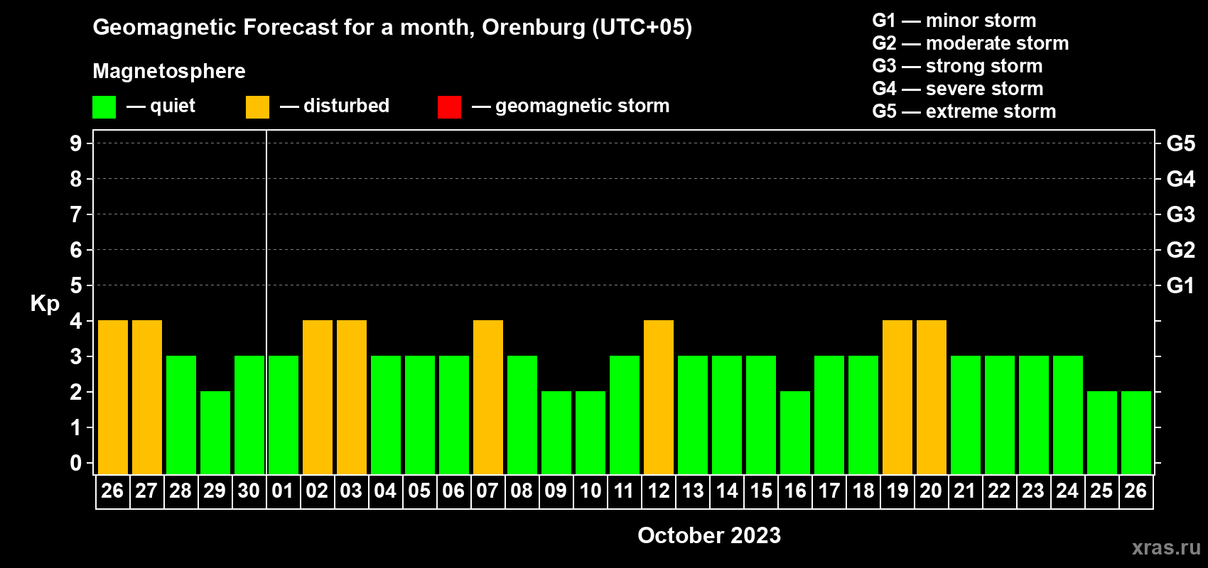 Geomagnetic storm forecast in Orenburg for Sep 26, 2023