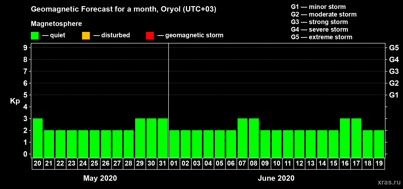 Geomagnetic activity forecast in Oryol — May 20, 2020