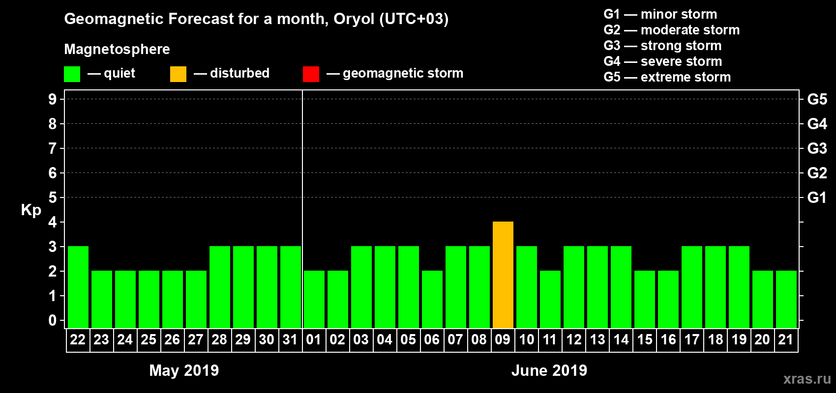 Geomagnetic activity forecast in Oryol — May 22, 2019