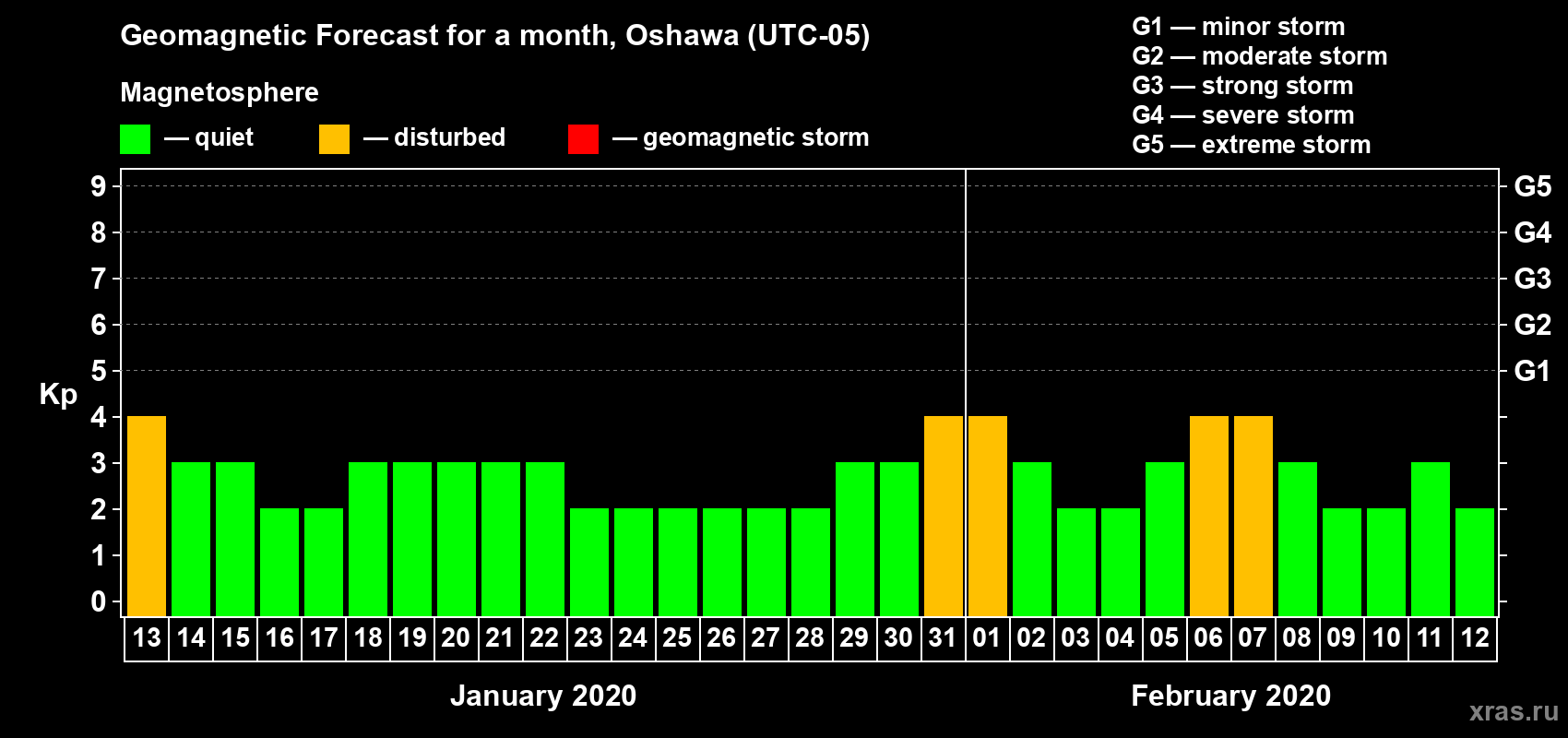 Geomagnetic storm forecast in Oshawa for Jan 13, 2020