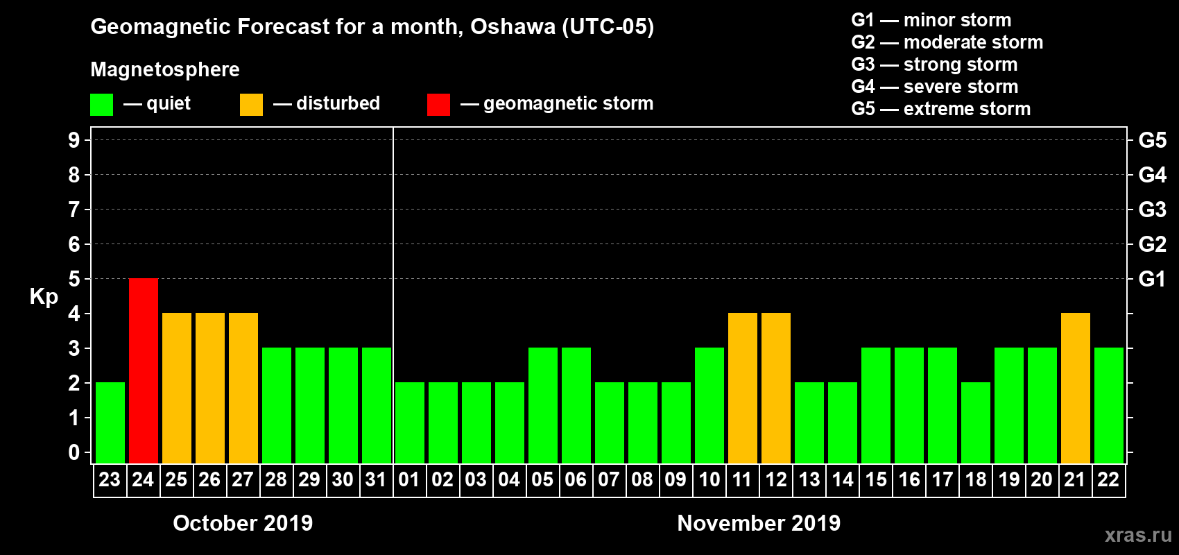 Geomagnetic storm forecast in Oshawa for Oct 23, 2019