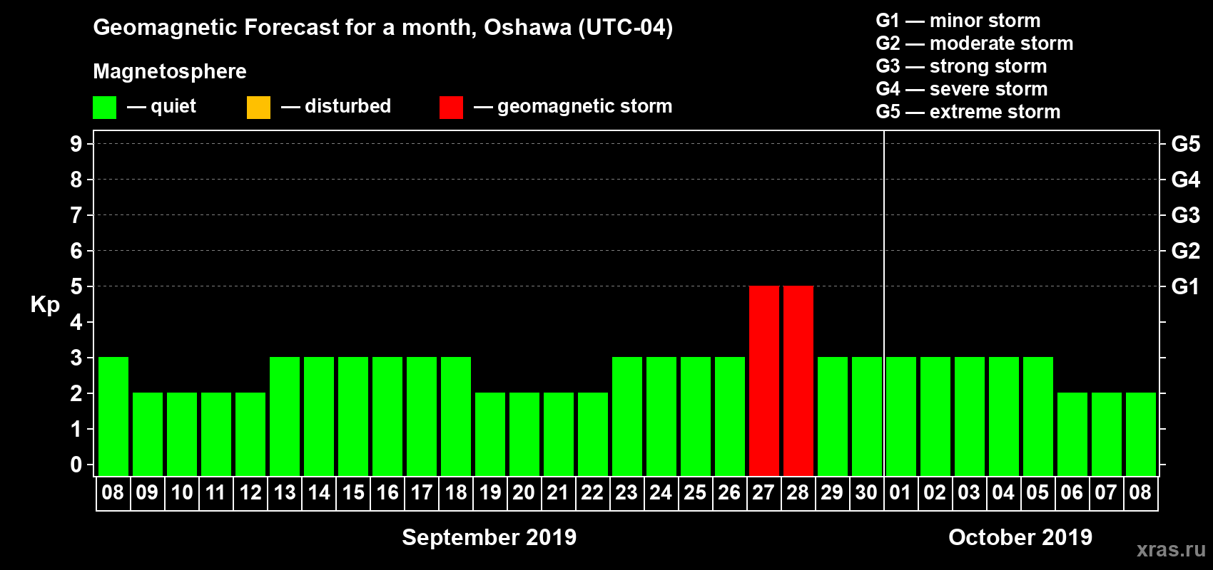 Geomagnetic storm forecast in Oshawa for Sep 08, 2019