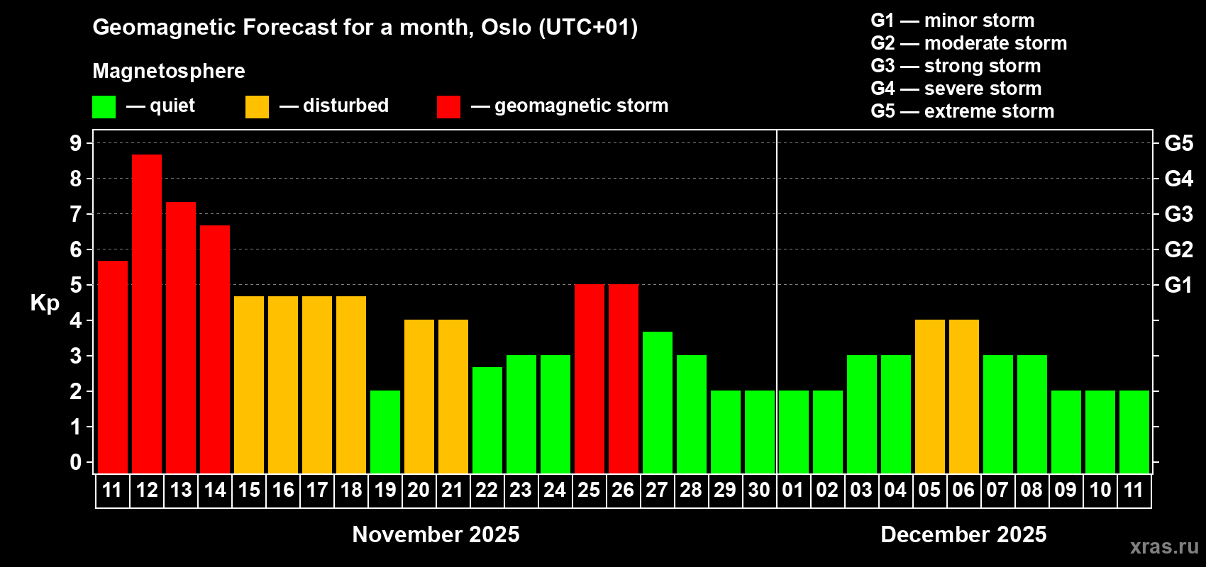Geomagnetic storm forecast in Oslo for Nov 11, 2025
