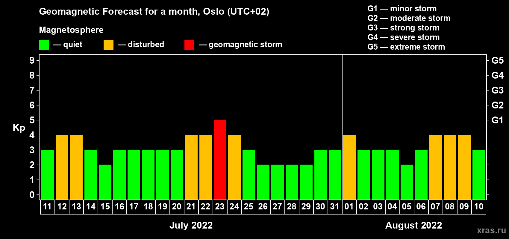 Geomagnetic storm forecast in Oslo for Jul 11, 2022