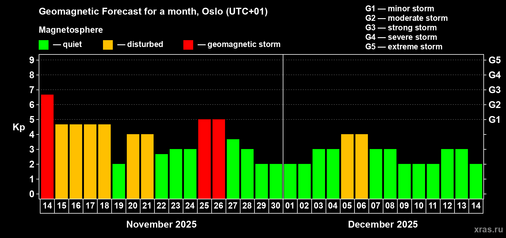 Geomagnetic storm forecast in Oslo for Nov 14, 2025