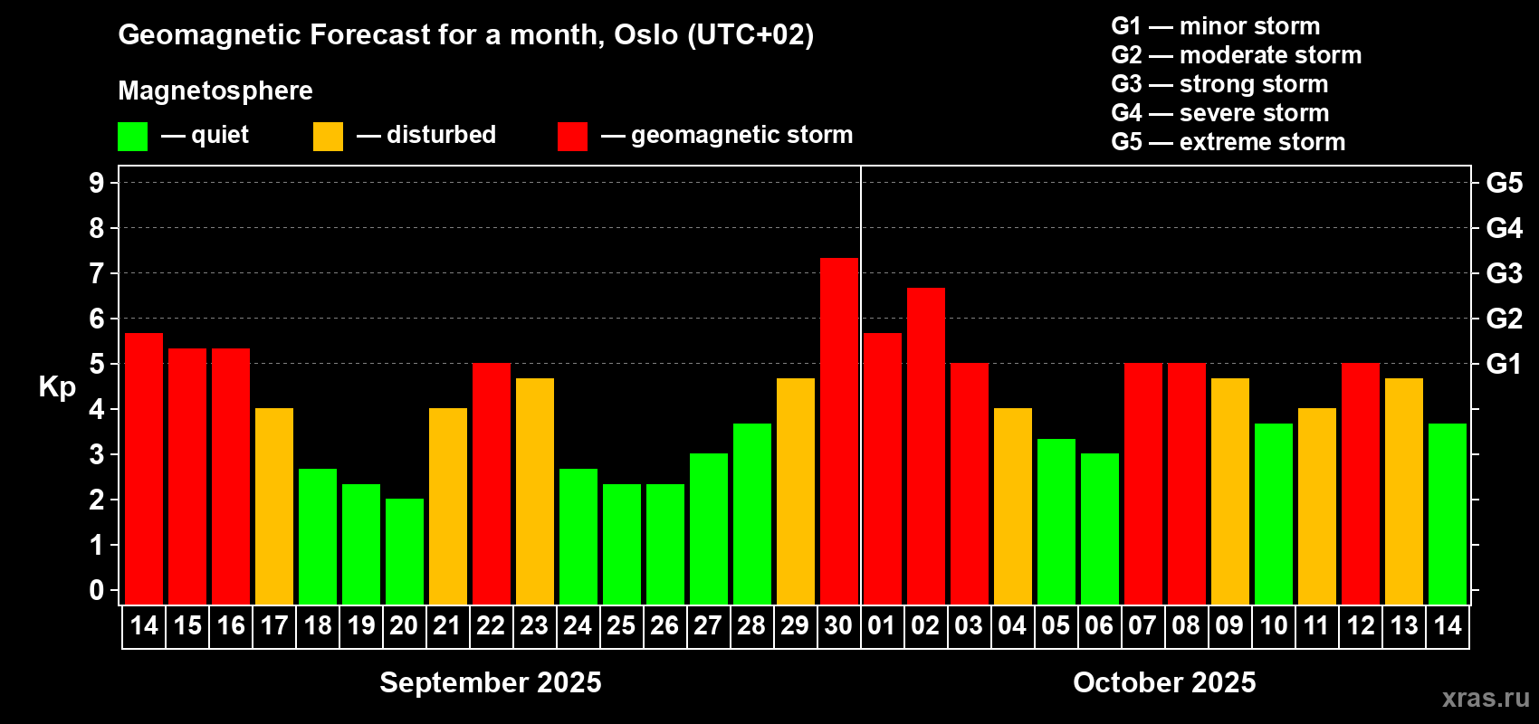 Geomagnetic storm forecast in Oslo for Sep 14, 2025