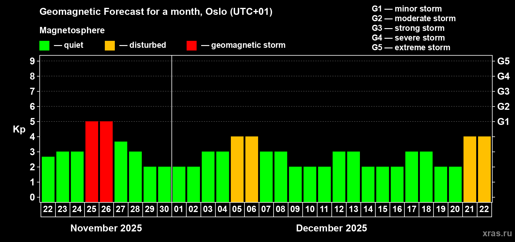 Geomagnetic storm forecast in Oslo for Nov 22, 2025