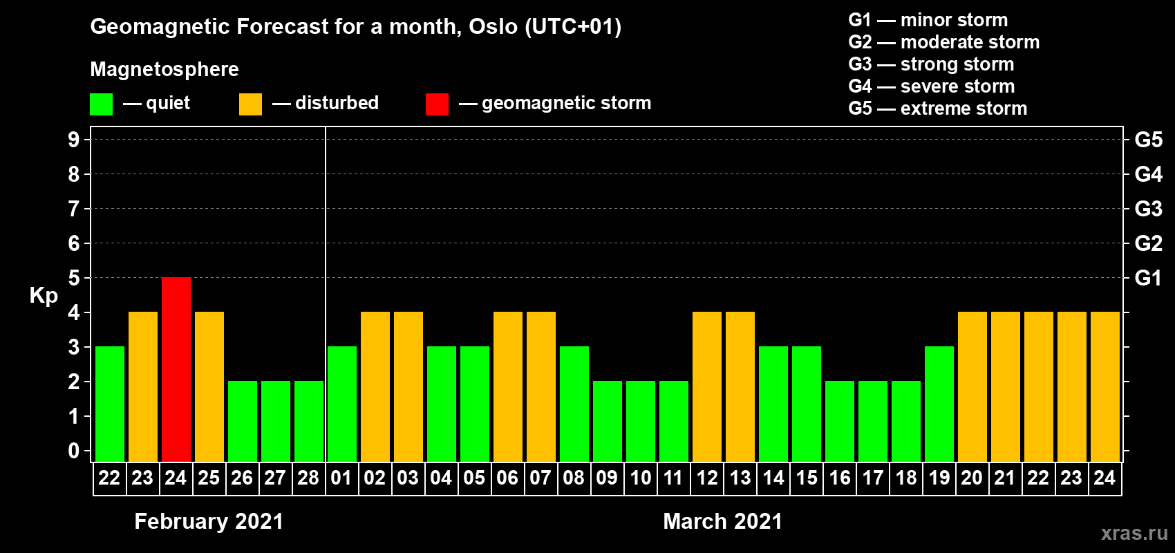Geomagnetic storm forecast in Oslo for Feb 22, 2021