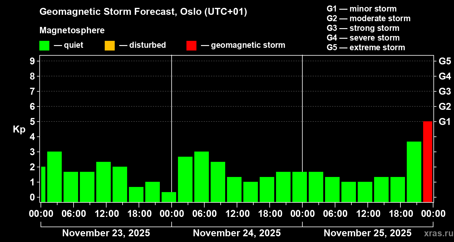 Geomagnetic storm forecast in Oslo for Nov 23, 2025