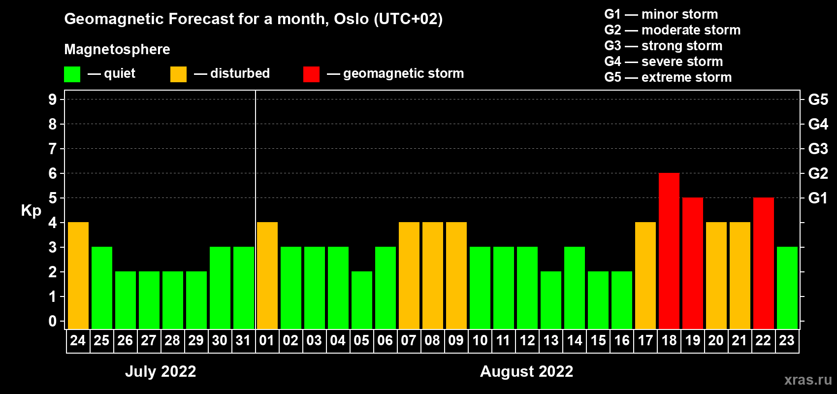 Geomagnetic storm forecast in Oslo for Jul 24, 2022