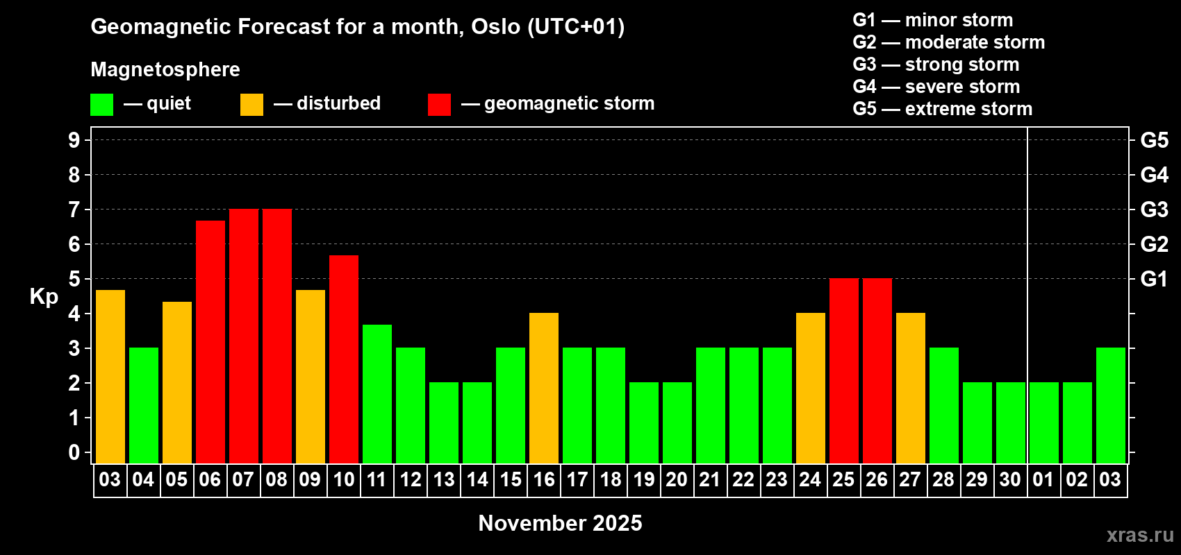 Geomagnetic storm forecast in Oslo for Nov 03, 2025