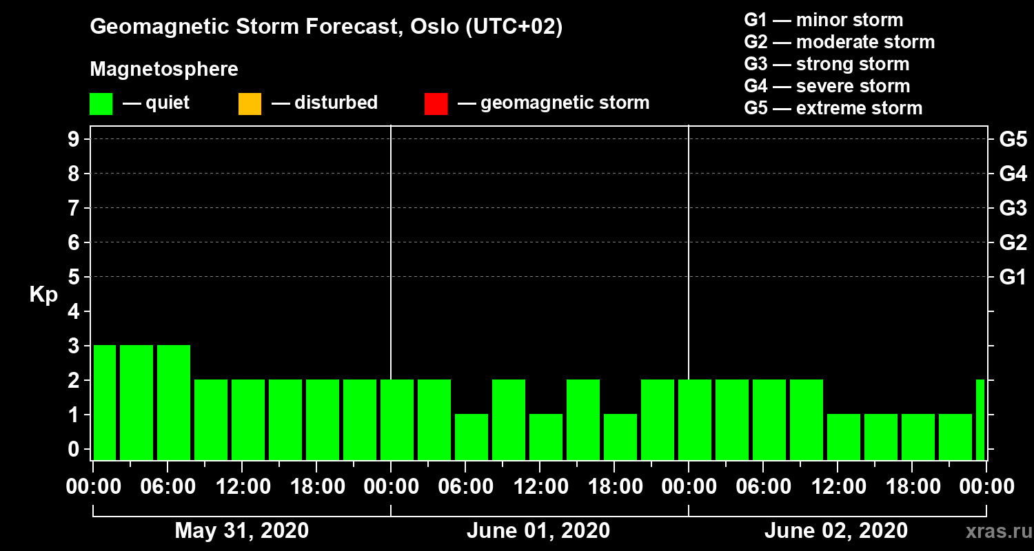 Geomagnetic storm forecast in Oslo for May 31, 2020