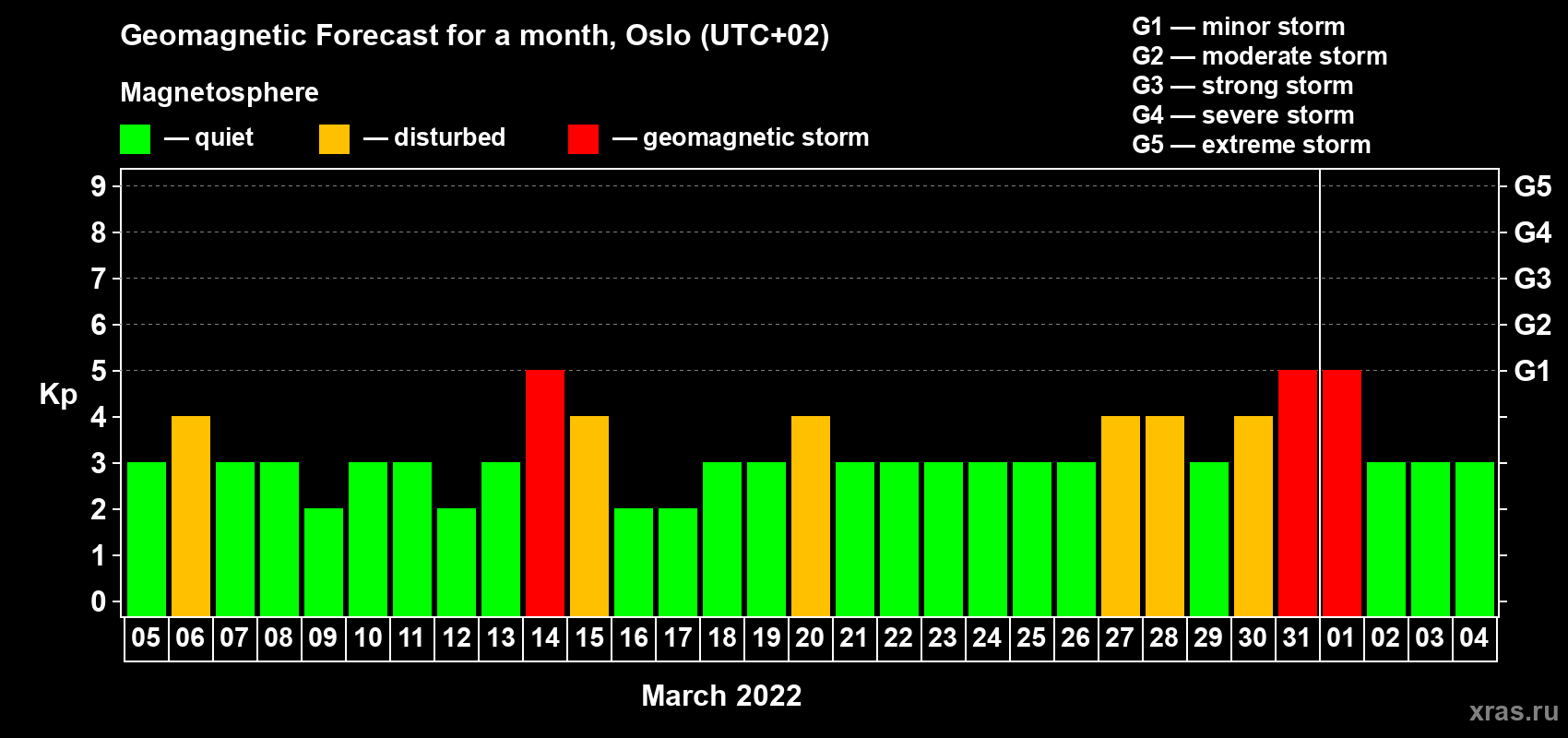 Geomagnetic storm forecast in Oslo for Mar 05, 2022