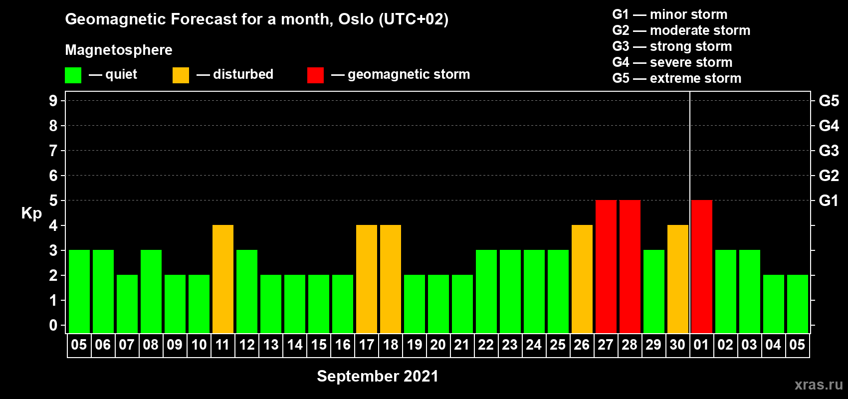 Geomagnetic storm forecast in Oslo for Sep 05, 2021