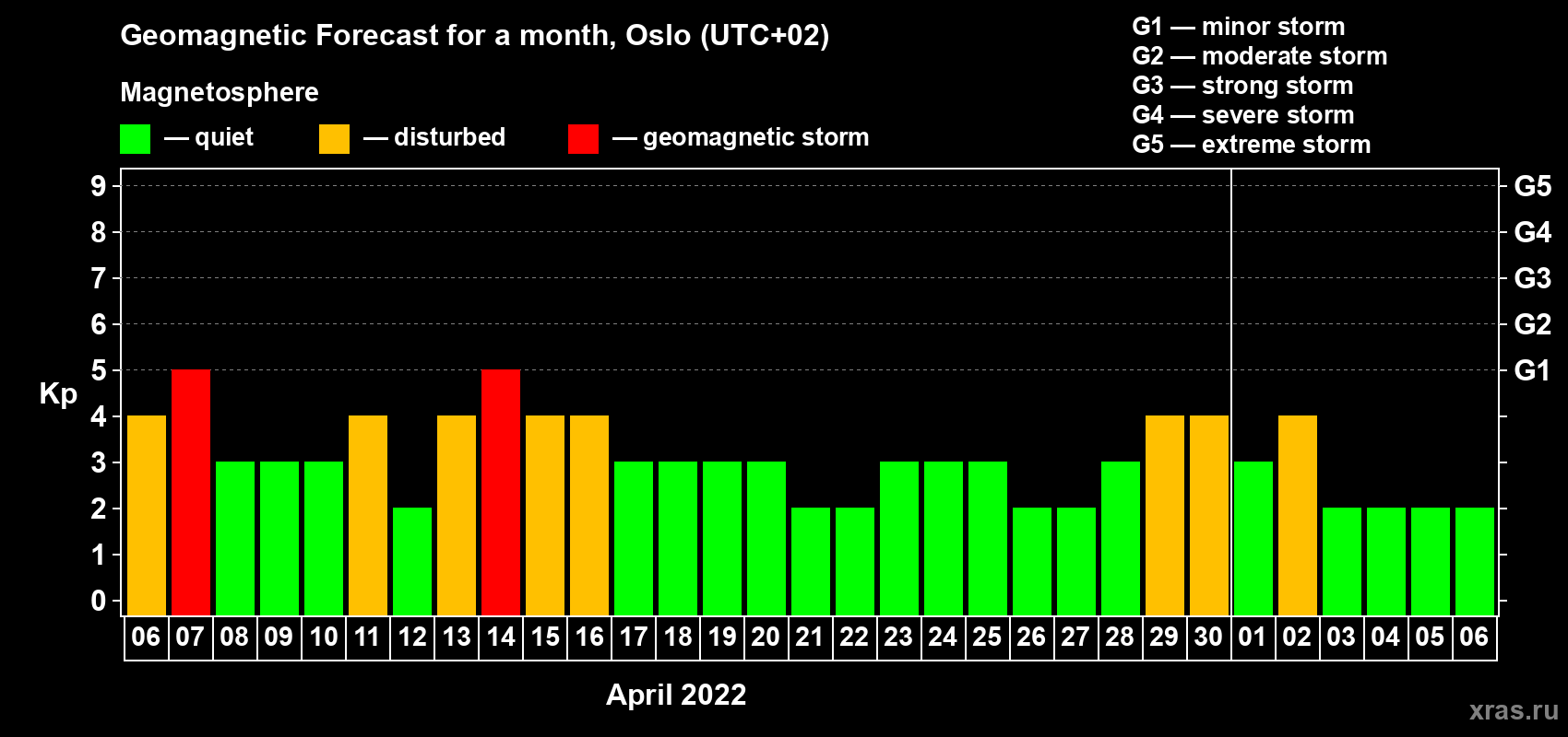 Geomagnetic storm forecast in Oslo for Apr 06, 2022