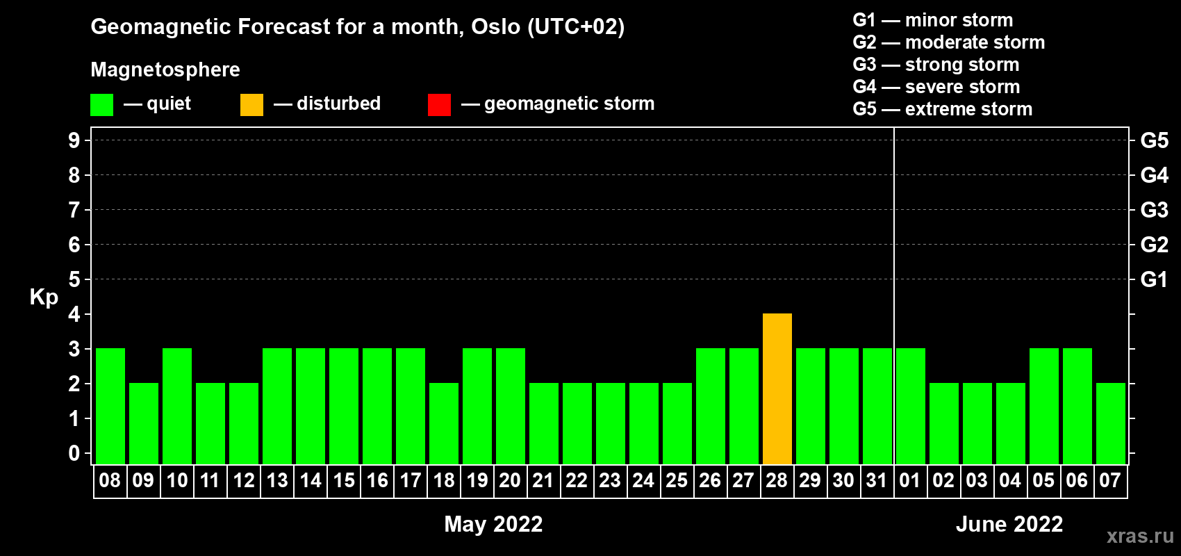 Geomagnetic storm forecast in Oslo for May 08, 2022