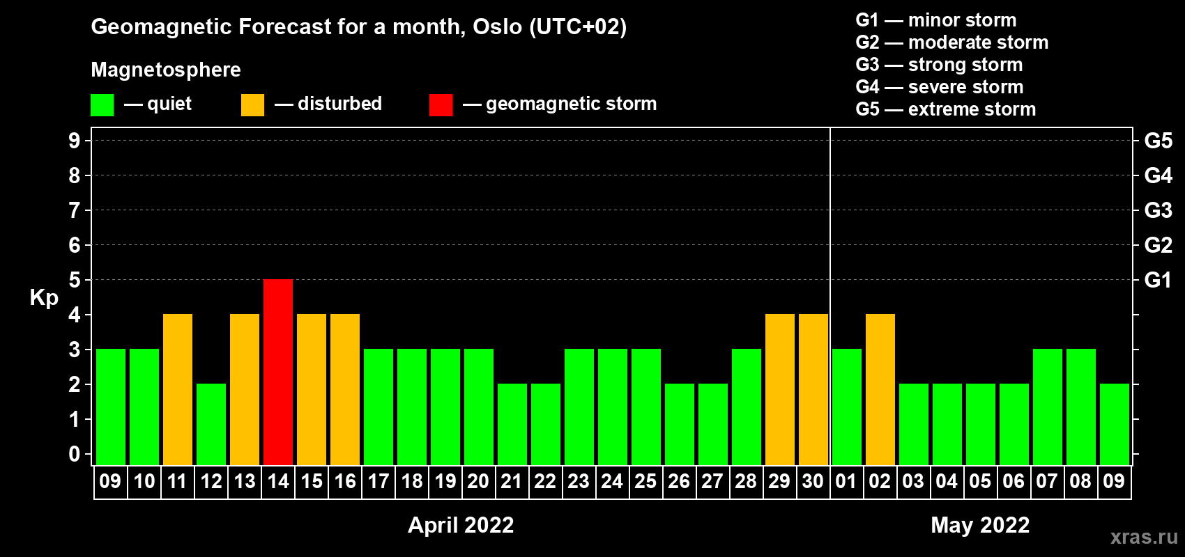 Geomagnetic storm forecast in Oslo for Apr 09, 2022
