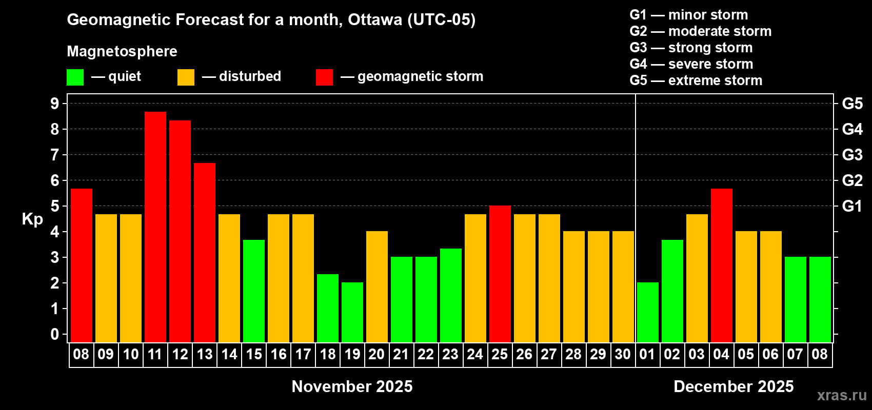 Geomagnetic storm forecast in Ottawa for Nov 08, 2025