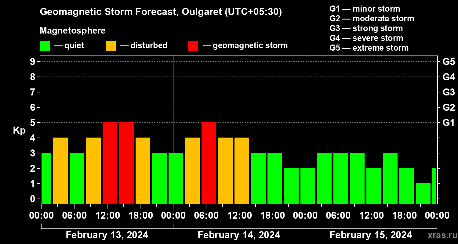 Geomagnetic storm forecast in Oulgaret for Feb 13, 2024