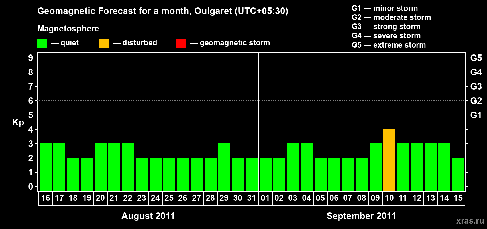 Geomagnetic storm forecast in Oulgaret for Aug 16, 2011