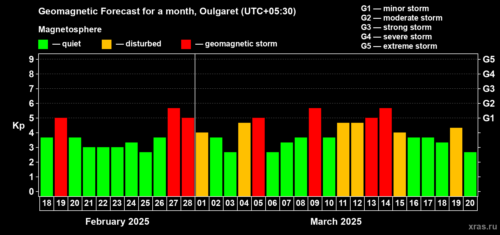 Geomagnetic storm forecast in Oulgaret for Feb 18, 2025