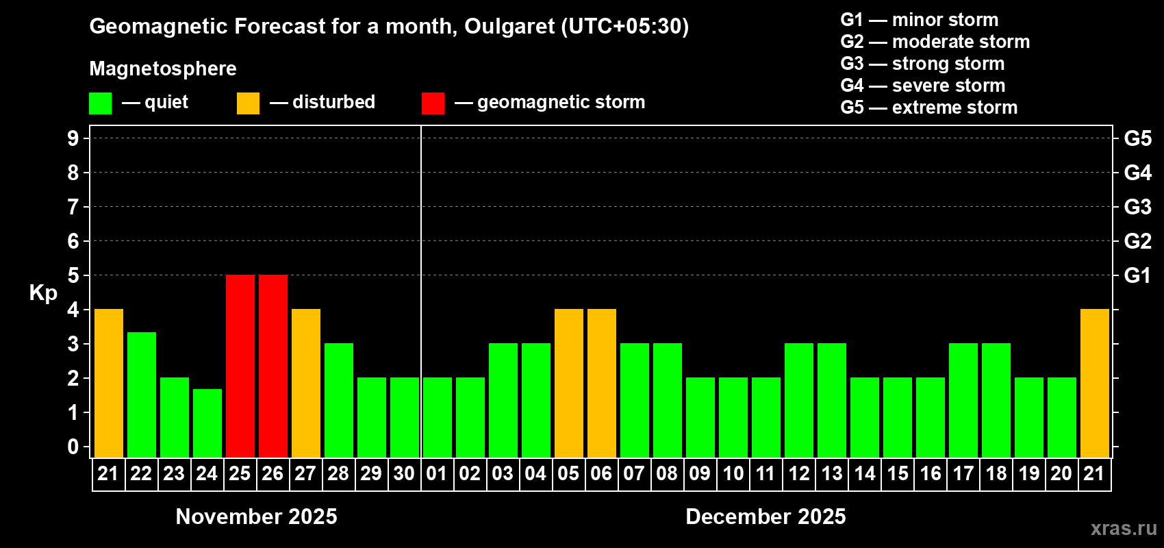 Geomagnetic storm forecast in Oulgaret for Nov 21, 2025