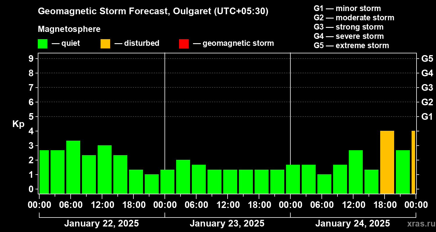 Geomagnetic storm forecast in Oulgaret for Jan 22, 2025