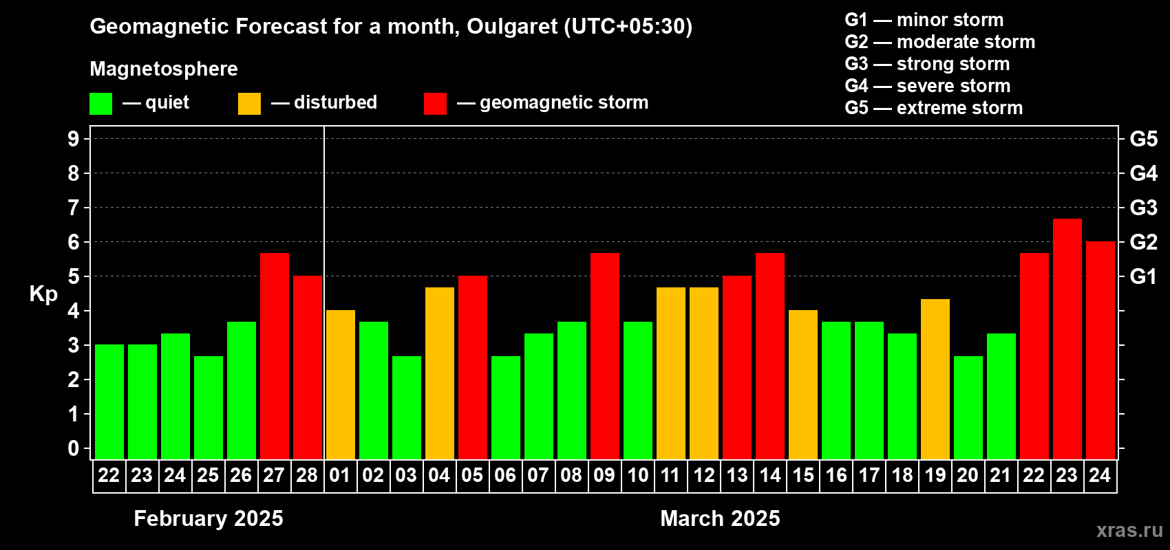 Geomagnetic storm forecast in Oulgaret for Feb 22, 2025