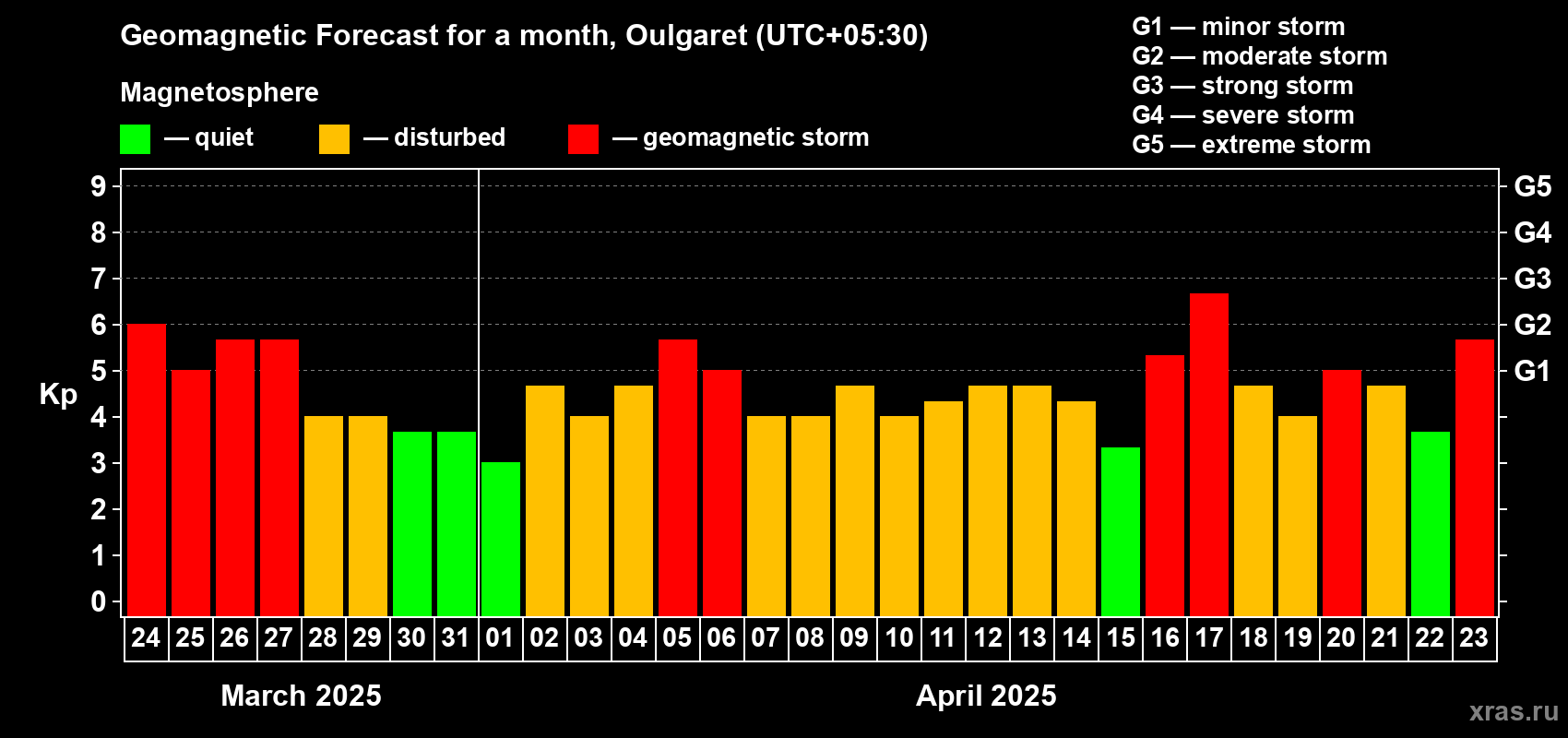 Geomagnetic storm forecast in Oulgaret for Mar 24, 2025