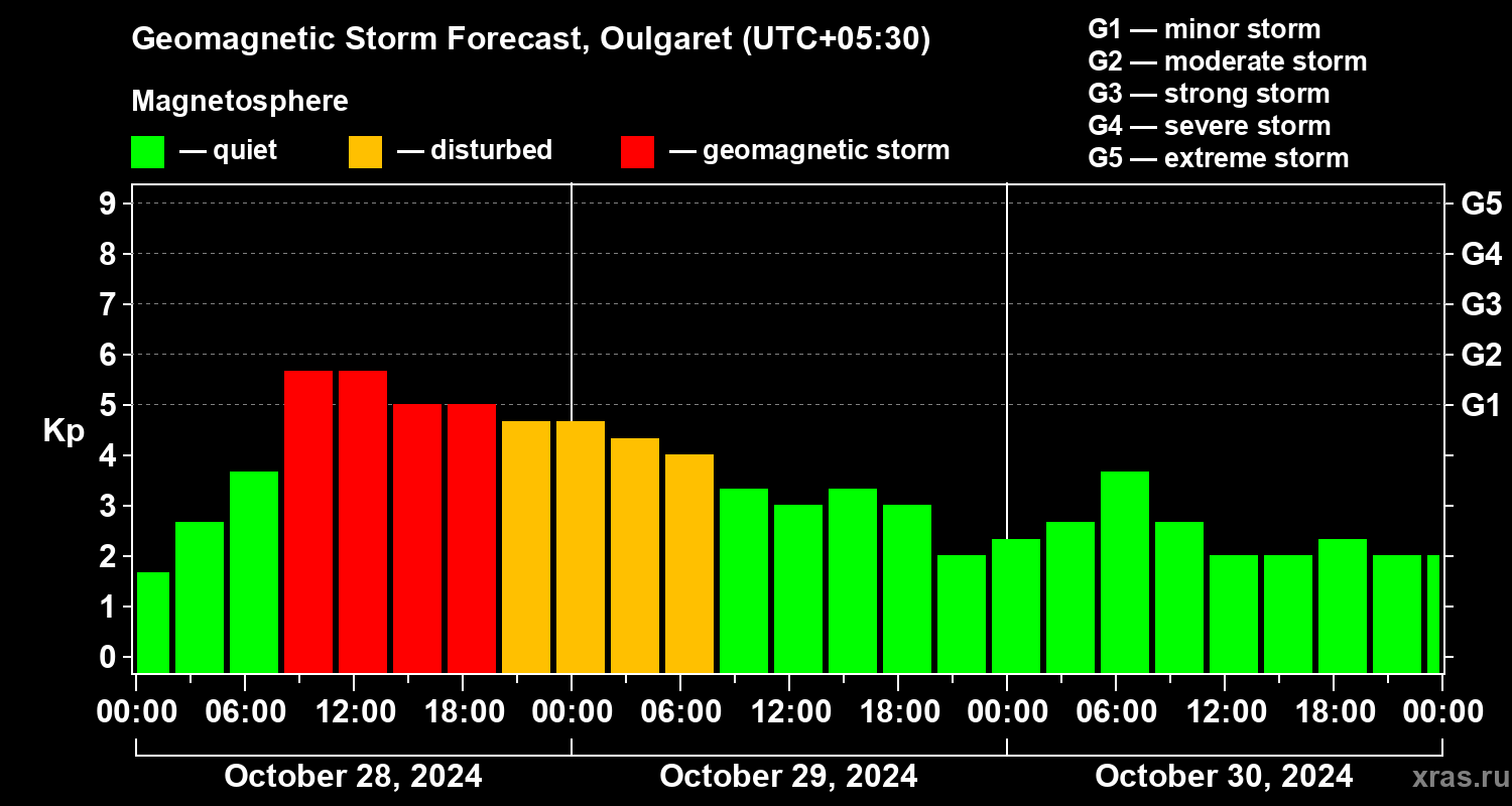 Geomagnetic storm forecast in Oulgaret for Oct 28, 2024