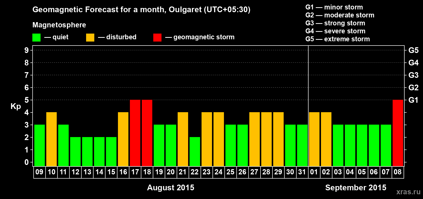 Geomagnetic storm forecast in Oulgaret for Aug 09, 2015