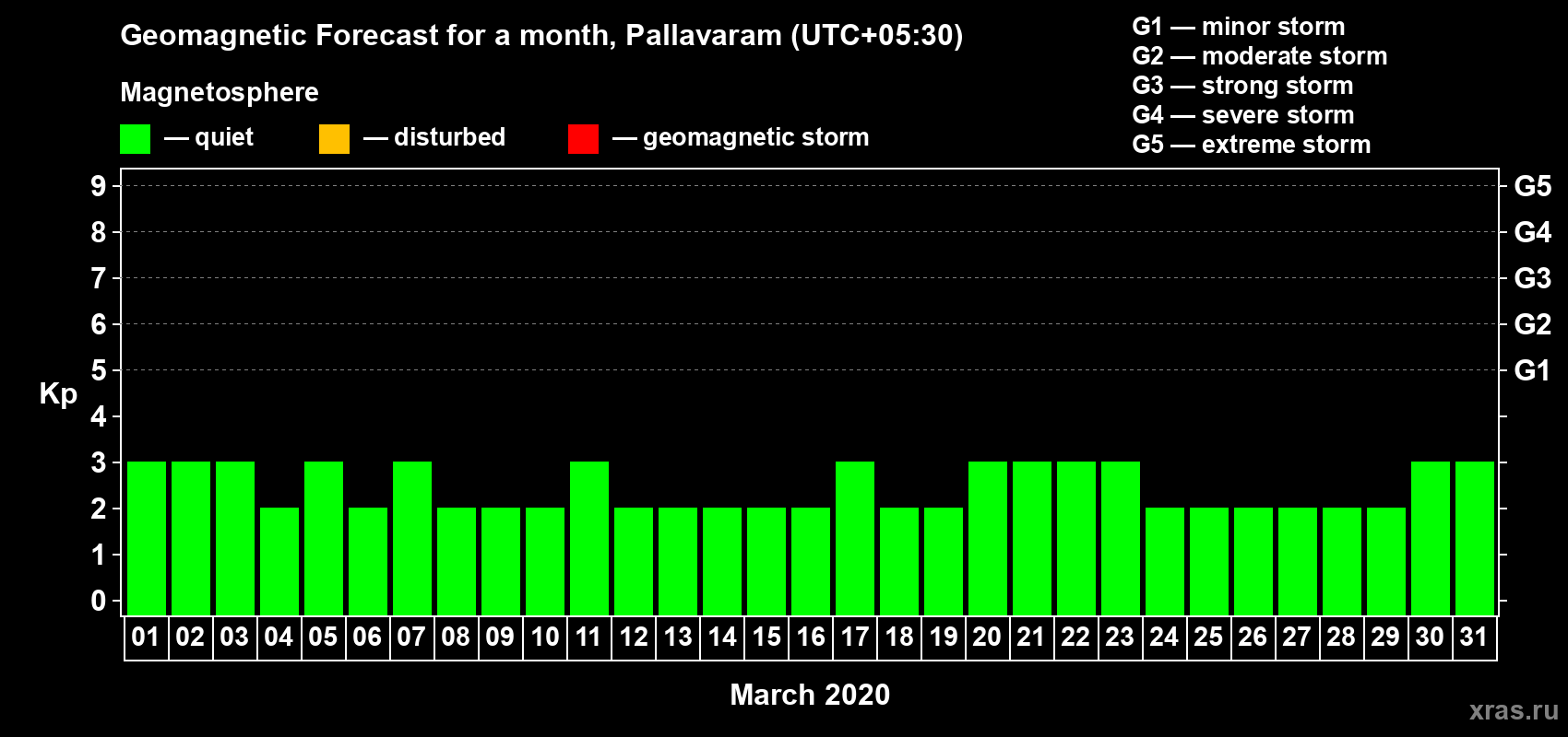 Geomagnetic storm forecast in Pallavaram for Mar 01, 2020