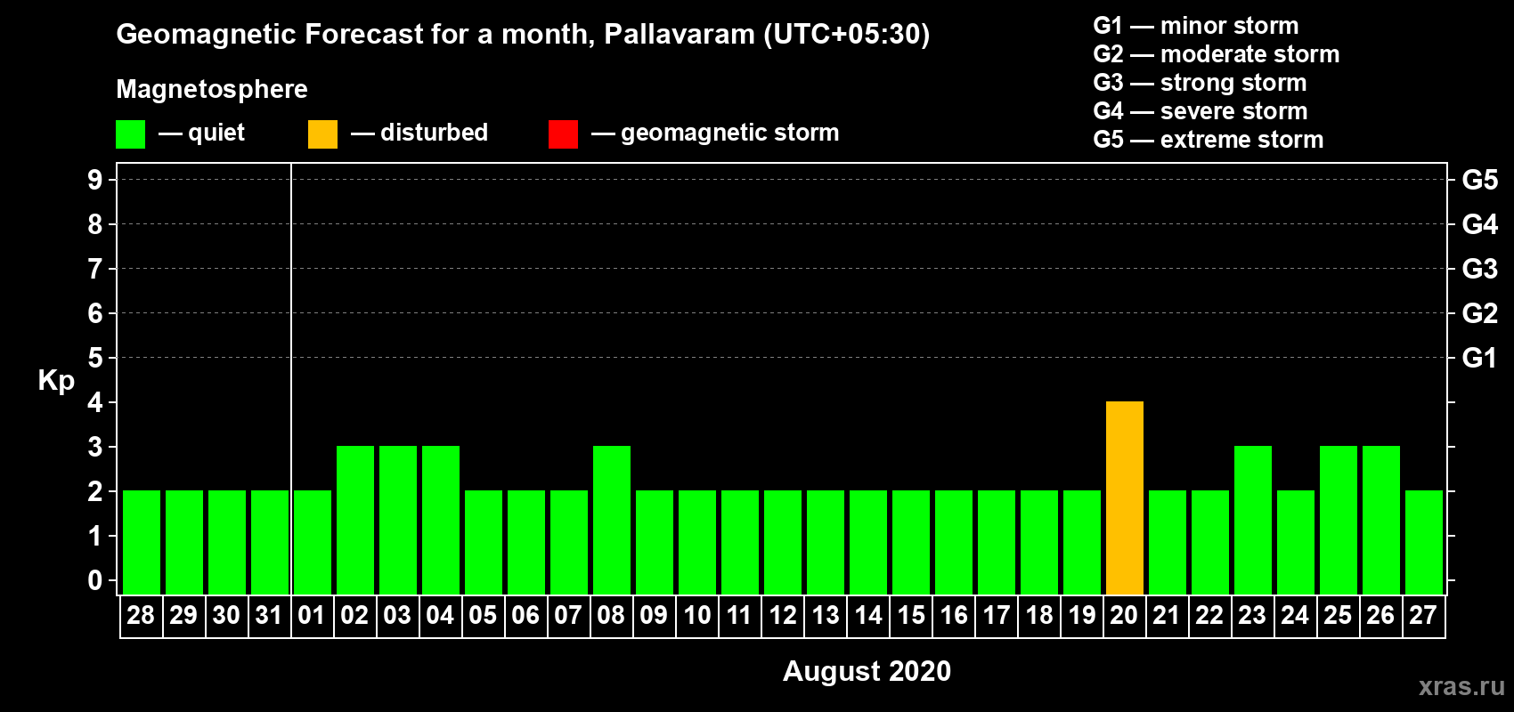 Geomagnetic storm forecast in Pallavaram for Jul 28, 2020