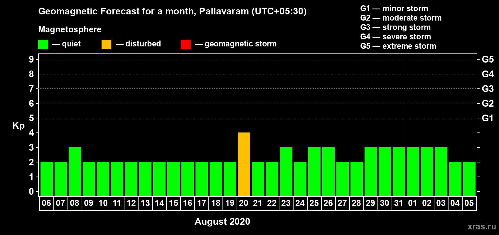 Geomagnetic storm forecast in Pallavaram for Aug 06, 2020