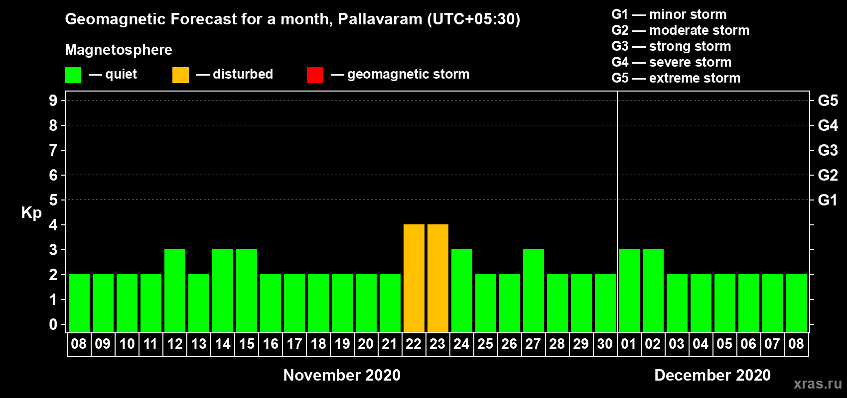 Geomagnetic storm forecast in Pallavaram for Nov 08, 2020