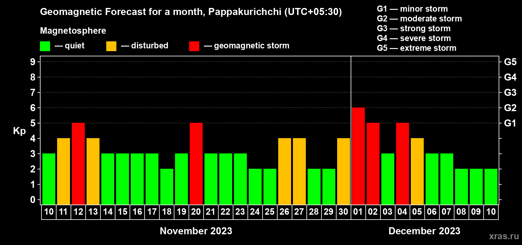 Geomagnetic storm forecast in Pappakurichchi for Nov 10, 2023