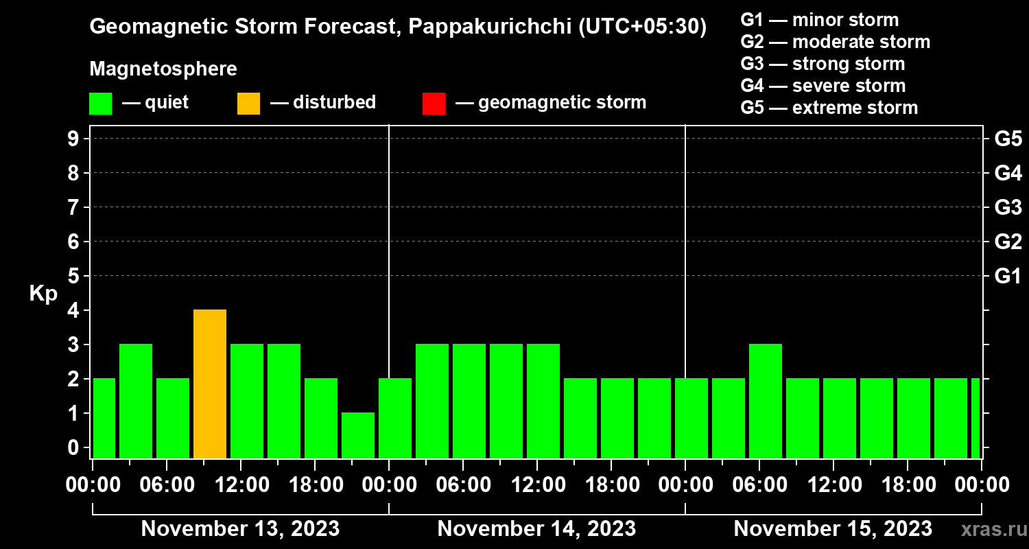 Geomagnetic storm forecast in Pappakurichchi for Nov 13, 2023