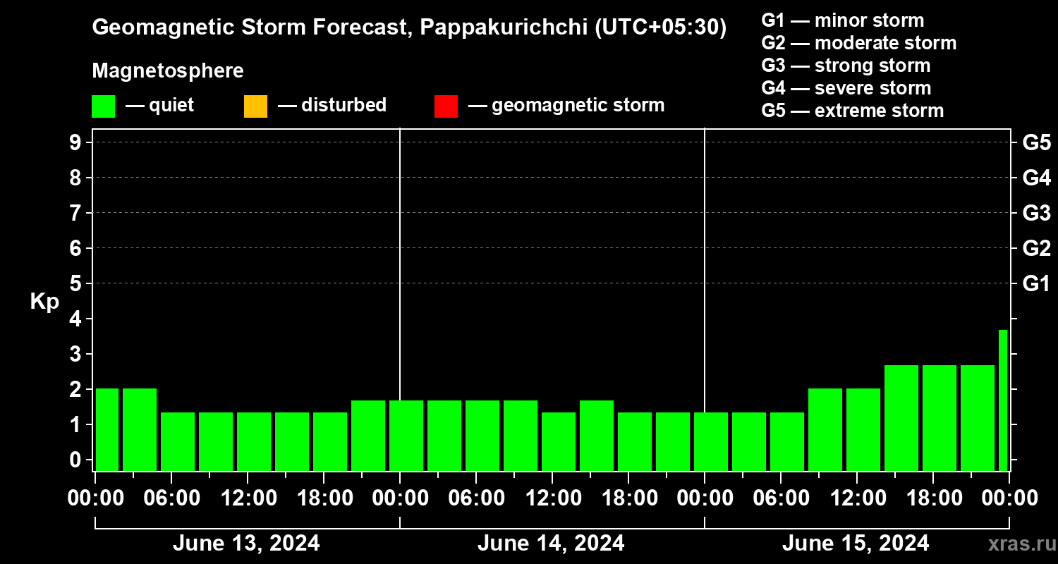Geomagnetic storm forecast in Pappakurichchi for Jun 13, 2024