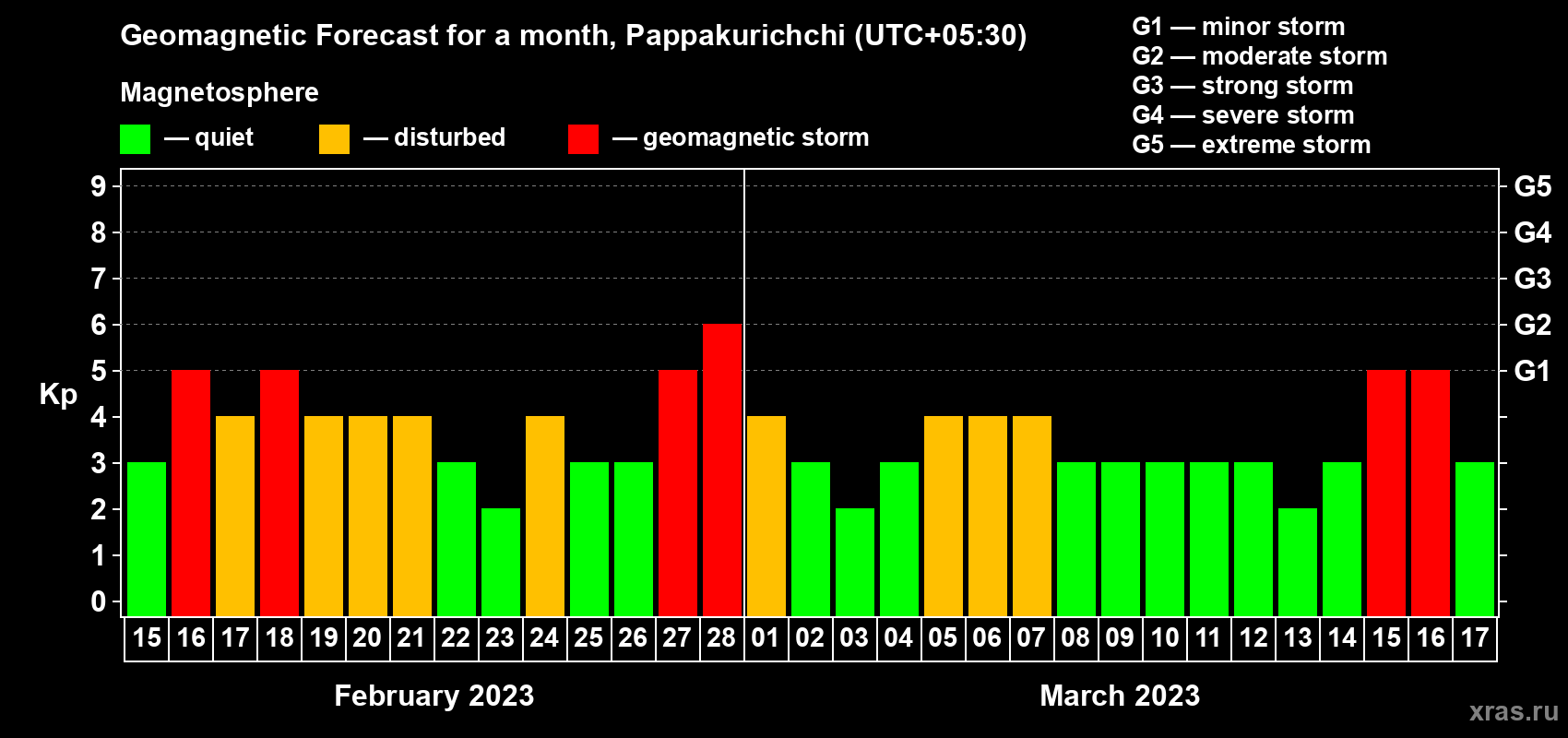 Geomagnetic storm forecast in Pappakurichchi for Feb 15, 2023