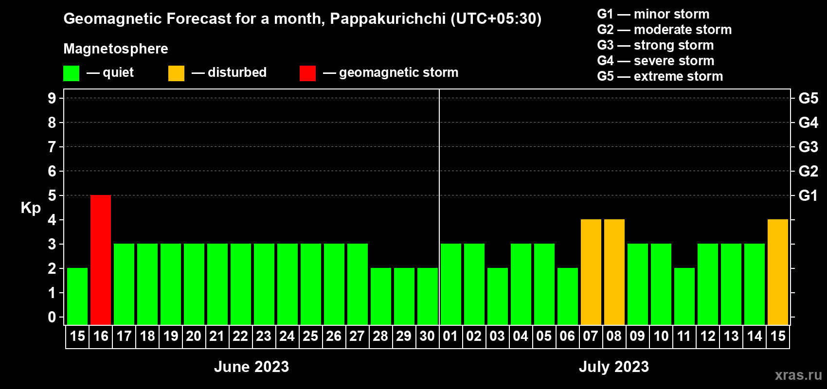 Geomagnetic storm forecast in Pappakurichchi for Jun 15, 2023